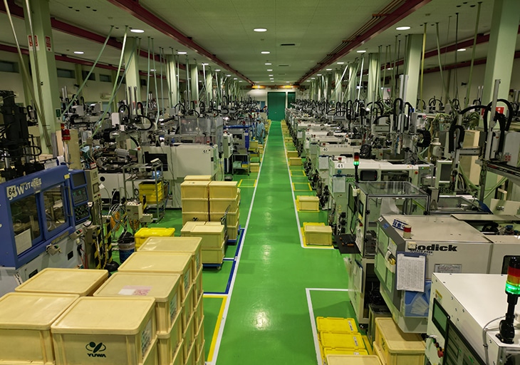 A total of more than 450 molding machines are in operation in Japan and overseas, of which more than 110 molding machines operate 24 hours a day at the Yuwa headquarters plant.