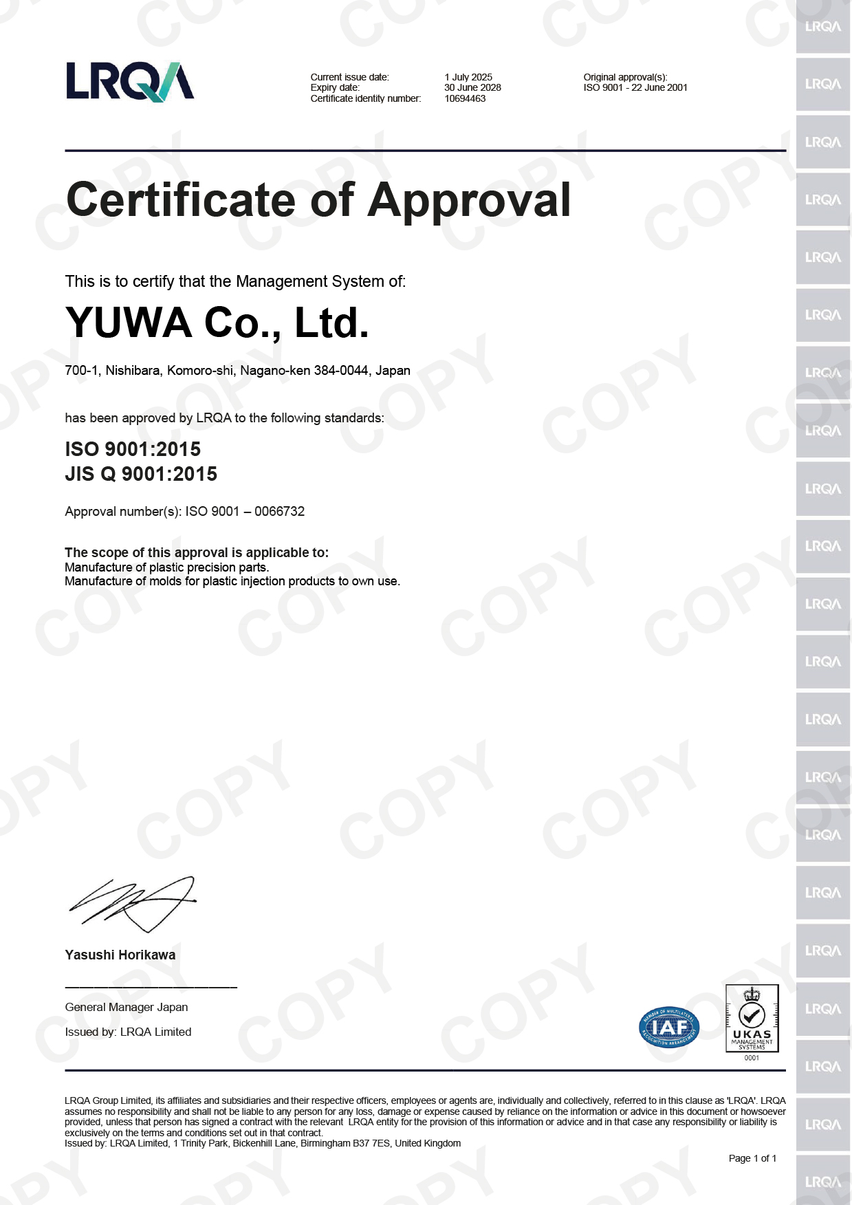 Quality assurance is the heart of Yuwa. Mold manufacturing in temperature-controlled rooms, injection molded parts produced in a clean environment.