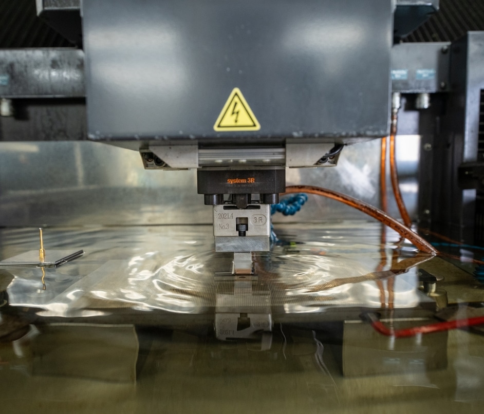 The processing fluid for the wire EDM machine uses rainwater that has been filtered and recirculated. This reduces the need for ion exchange resin replacement, contributing to an 80% cost reduction.